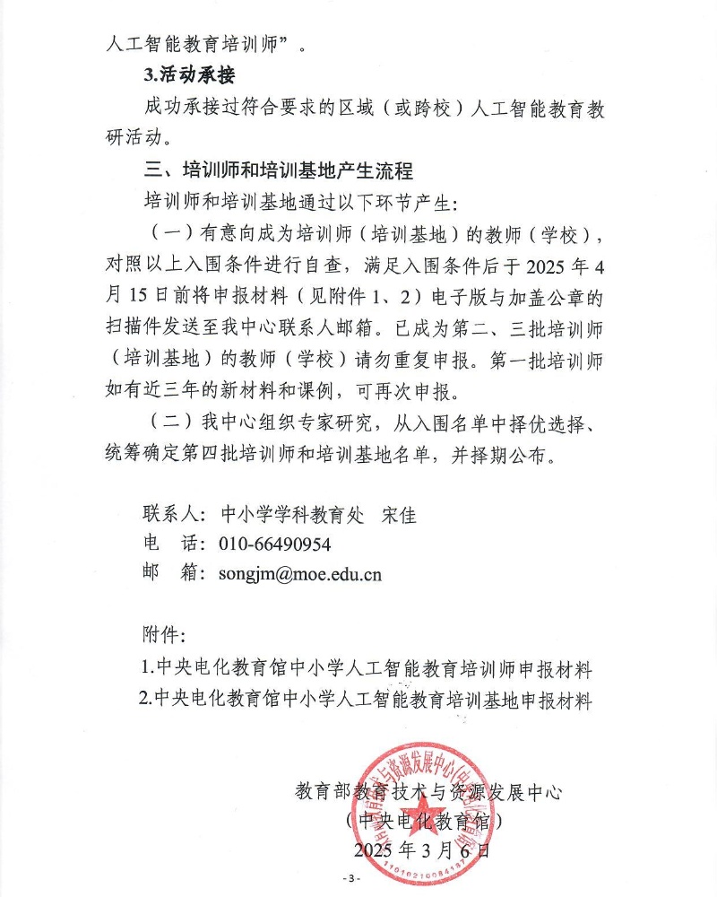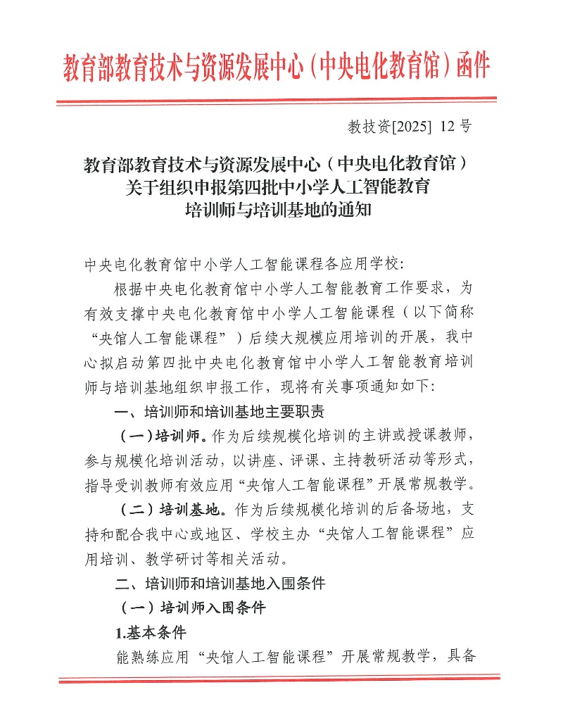 教育部關于組織申報第四批中小學人工智能教育培訓師與培訓基地的通知