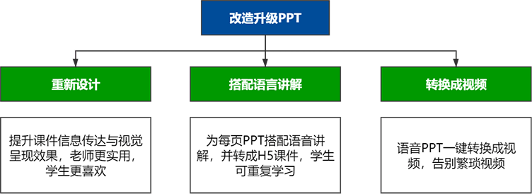 但PPT資源往往過于陳舊,跟不上教學設計與方式的改革,也滿足不了學生對于學習質量的追求。對一門課程的所有PPT課件進行統一改造升級,增添其美觀度、可讀性與趣味性,并將其轉化成傳播性極佳的H5課件,搭配語音講解,實現傳統資源的創新轉化,